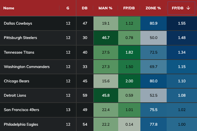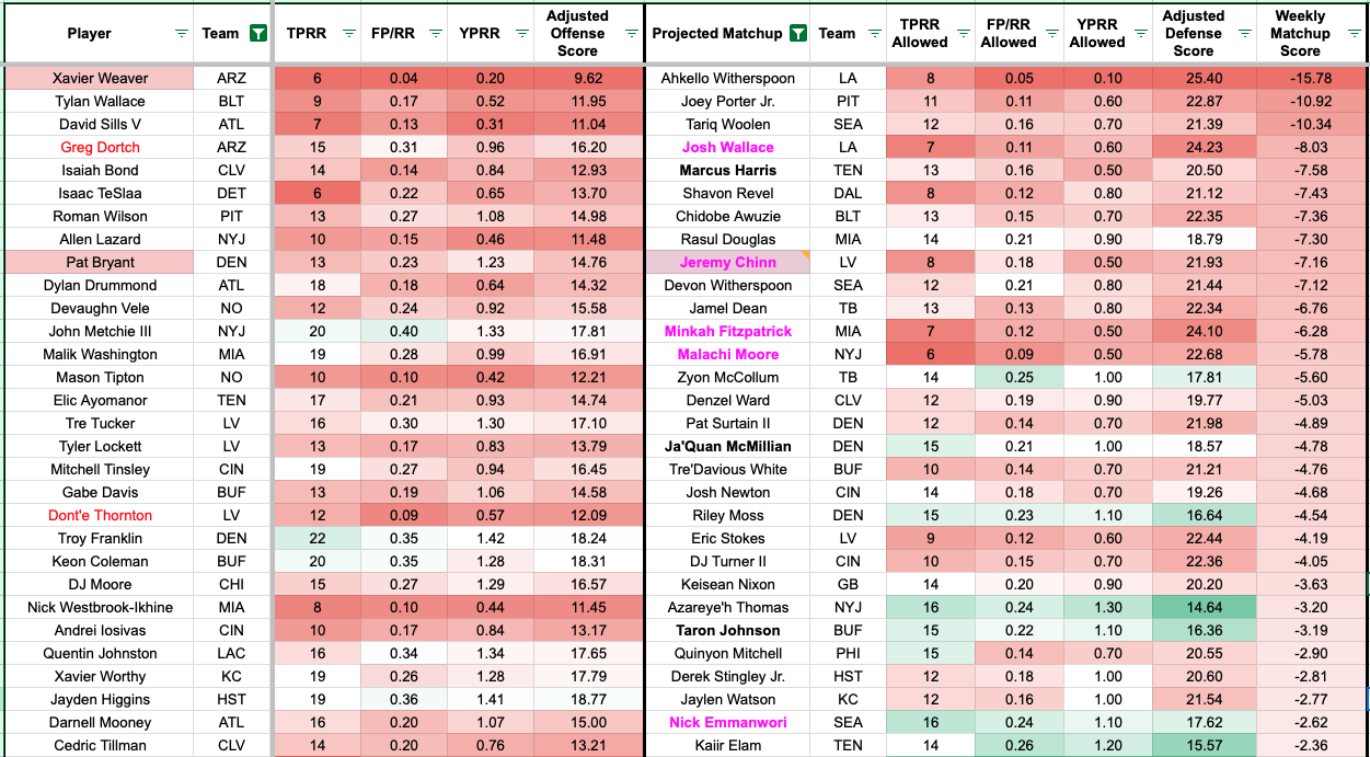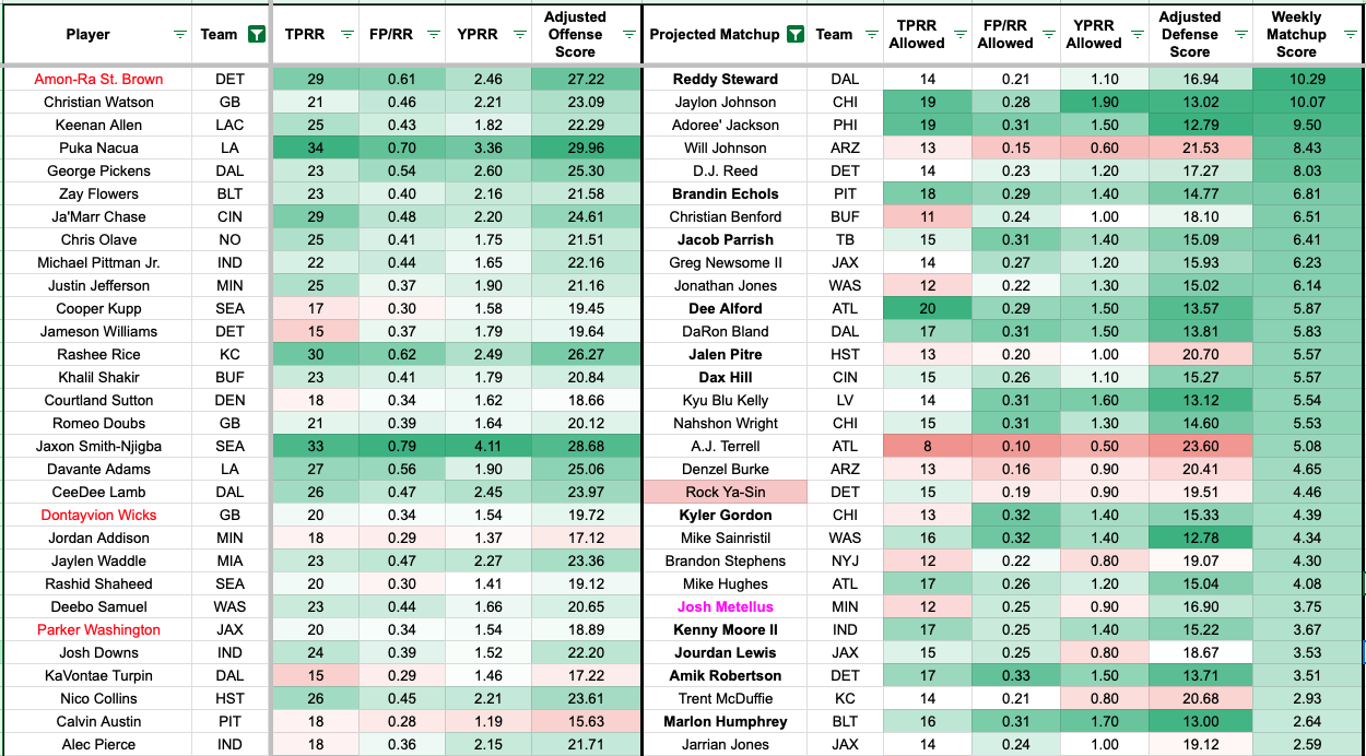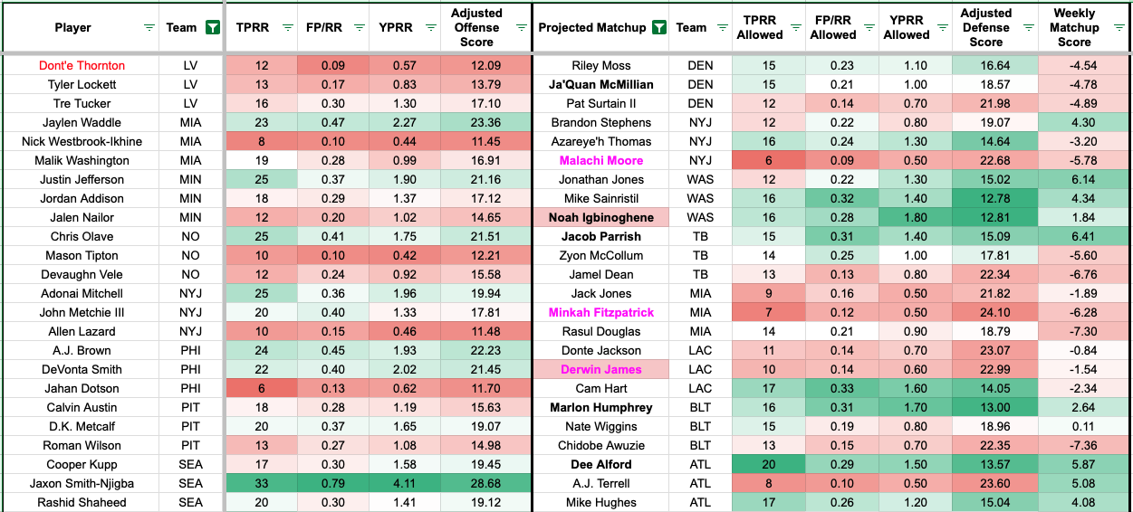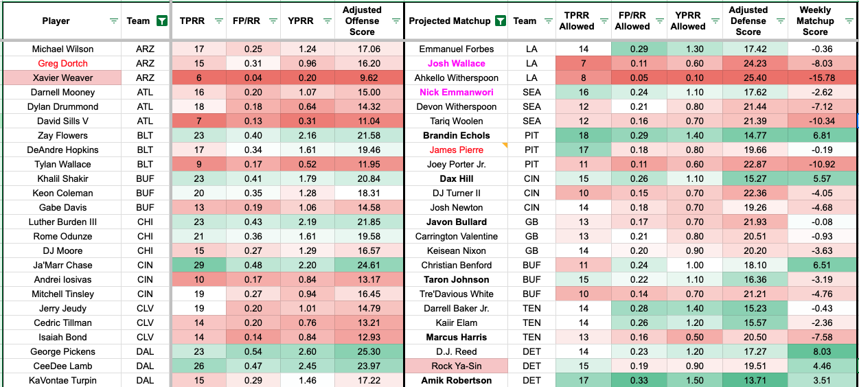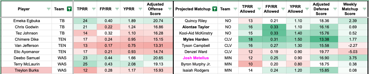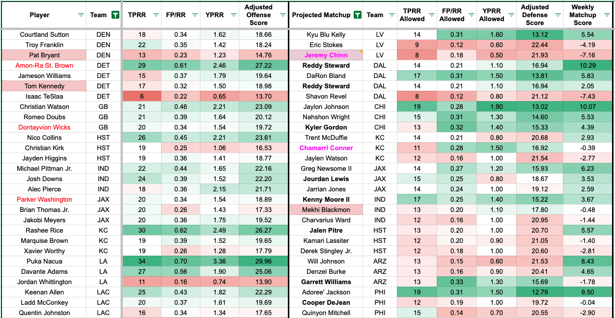 We added additional team-level metrics to the formula to account for team context. The red numbers indicate a more challenging matchup for the receiver, and the green numbers mean favorable matchups (or the defender allows a high rate of the given metric).