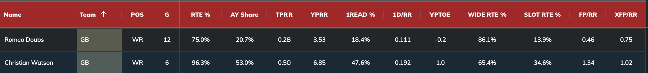 Watson and Romeo Doubs have been the Packers' primary two outside wide receivers, running a route over 75 percent of the time. Doubs and Watson have nearly identical first-read target shares, yet Watson bests Doubs in air yards share. Watson has been more efficient, recording a team-high 2.39 yards per route run among the healthy options.