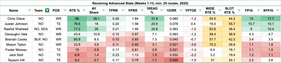 Johnson ranks second behind Olave in target rate (23 percent), first-read target share (22 percent), and yards per route run (1.58) against single-high looks. Olave has been playing more in the slot (47 percent) since Week 9, and the Buccaneers' defense allows the fourth-most PPR/G to the slot.