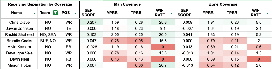 Specifically, the Buccaneers' pass defense deploys single-high looks at the fourth-highest rate, yet they've given up the fourth-most fantasy points per dropback. Olave thrives against single-high coverages. He garners a 30 percent target rate, 35.5 percent first-read target share, and 2.35 yards per route run. The visual below shows the Saints' pass catchers against single-high coverage.