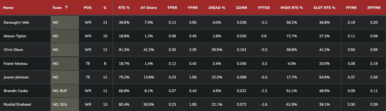 Olave has been seeing WR1-type usage, evidenced by his 17.7 expected fantasy points per game, ranking sixth among all pass catchers with 25 routes. Unfortunately, there have been offensive inefficiencies due to Olave's team context. That's evident by Olave's negative yards per target over expected (YPTOE). Olave leads the team in a significant margin in first-read target share and air yards.