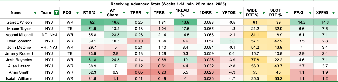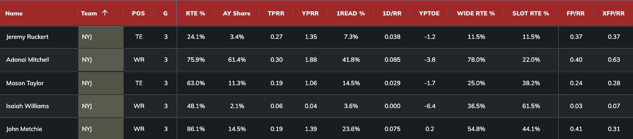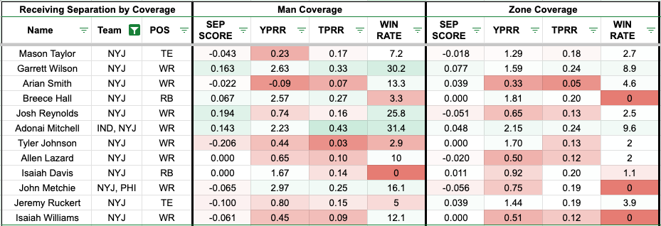 The visual above shows the Jets' pass catchers and their advanced stats against zone coverage since Week 11. When we filter by zone coverage since Week 11, when Mitchell played with the Jets, he led the team with a 43.3 percent first-read target share, 26 percent target rate, and 2.19 yards per route run. That's WR1-type usage, though that might be the peak.