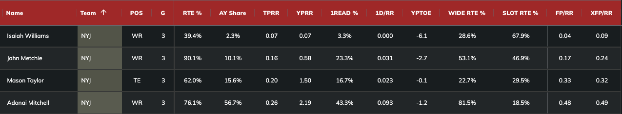 The season-long numbers don't do Mitchell justice, but he remains a per-route king, especially in targets and yards per route. Since Week 11, Mitchell leads the Jets with a 41.8 percent first-read target share, 30 percent target per route rate, and 1.88 yards per route run, as seen below. The first-read target rate and target per route rate alone hint at Mitchell's potential.