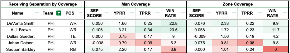 Smith leads the Eagles in yards per route run against zone coverage. However, he trails Brown in first-read targets (48.8 percent), yards per route run (3.59), and target rate (37 percent) over the past three games against zone coverage, as seen below. It's a small sample, but the gap in first-read targets shifted in Brown's favor rather than Smith's (24.4 percent).