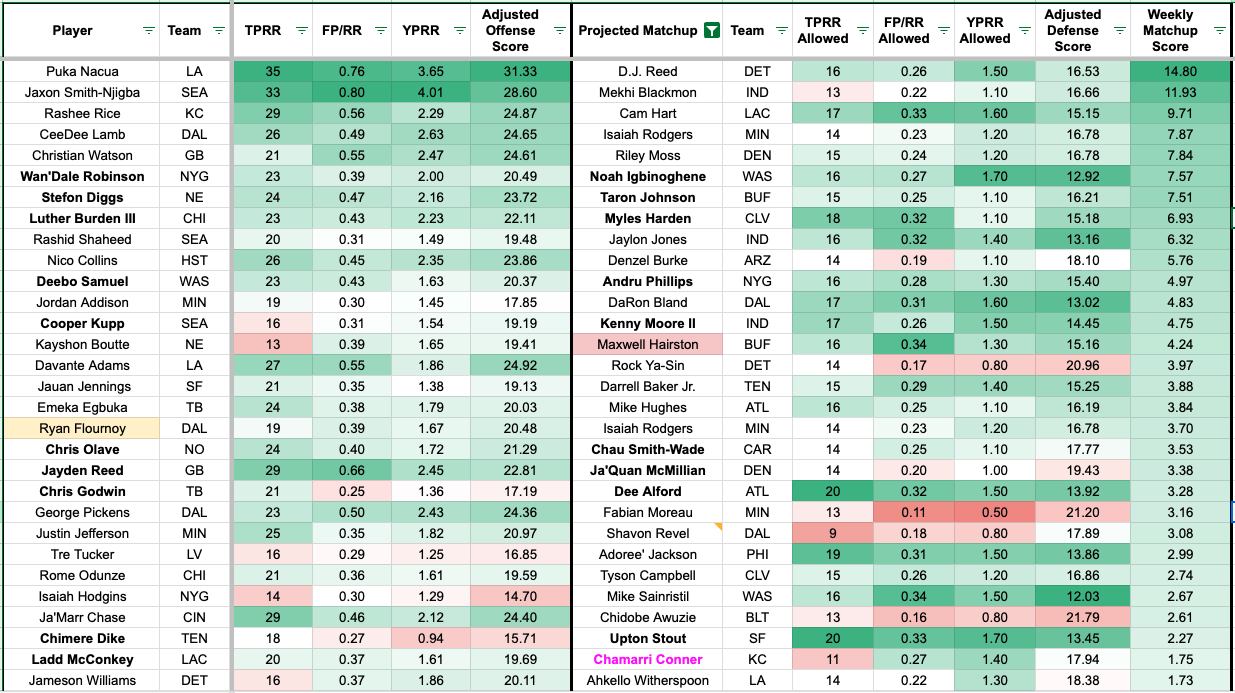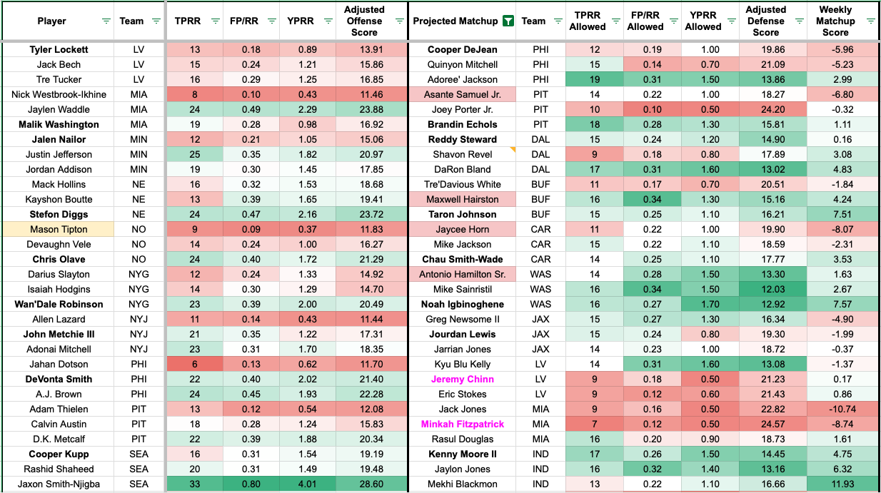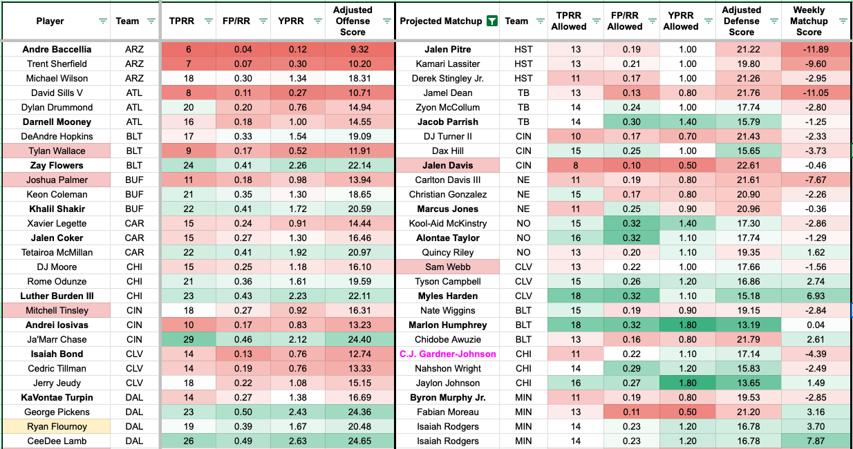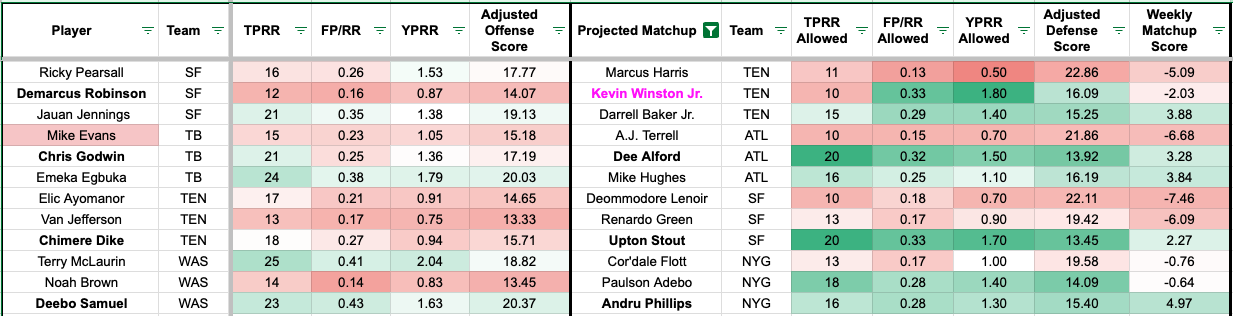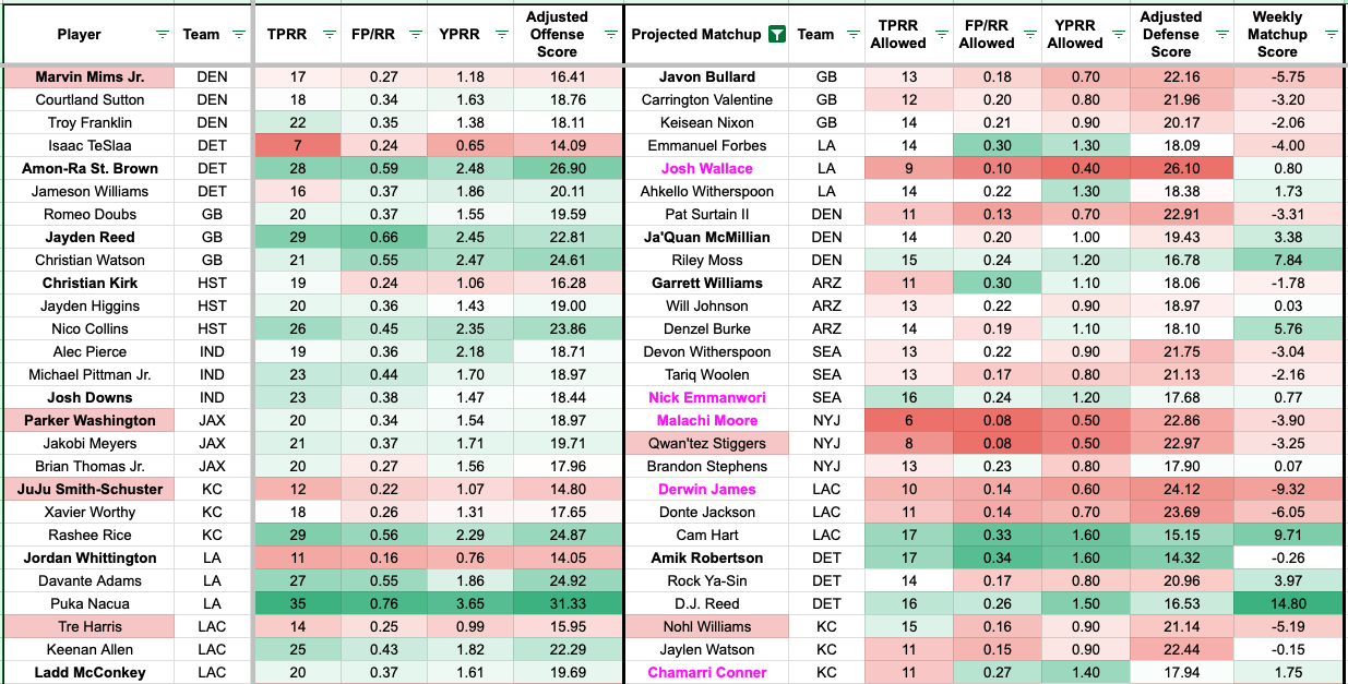 We added additional team-level metrics to the formula to account for team context. The red numbers indicate a more challenging matchup for the receiver, and the green numbers indicate a favorable matchup (or the defender allows a high rate on the given metric).
