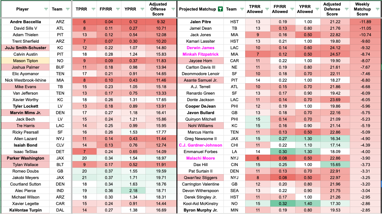 The WR/CB Matchup Chart is back again for 2025! You can find it below! We'll have the most favorable and unfavorable matchups based on several metrics. We used weighted averages to create an adjusted offensive and defensive score. Some inputs include yards per route run, fantasy points per route run, and targets per route run.