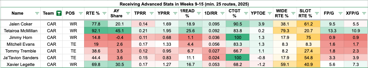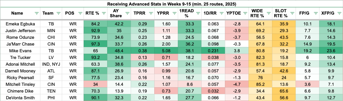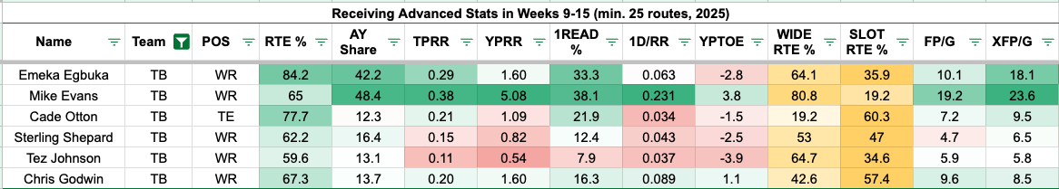 The visual below shows the Buccaneers' pass catchers in Weeks 9-15.