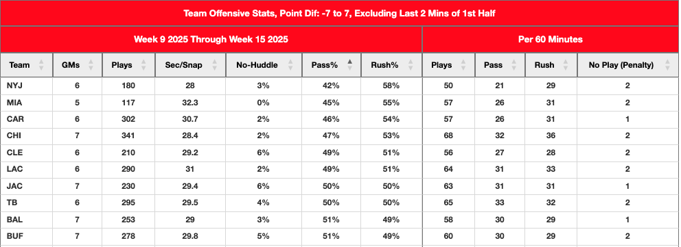 That indicates the Chargers have been leaning on the run game since Week 9, meaning their pass catchers need to rely upon efficiency. Keenan Allen leads the team with a 23.1 percent first-read target share and 21 percent target rate in Weeks 9-15.