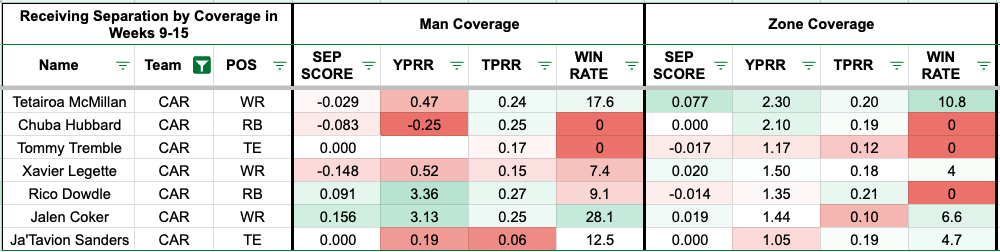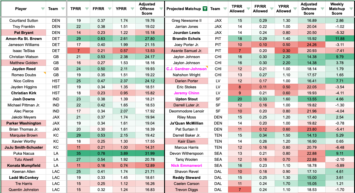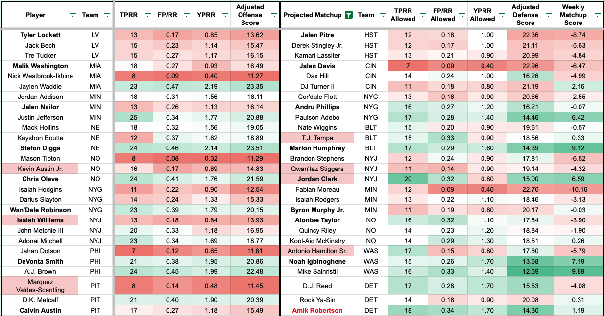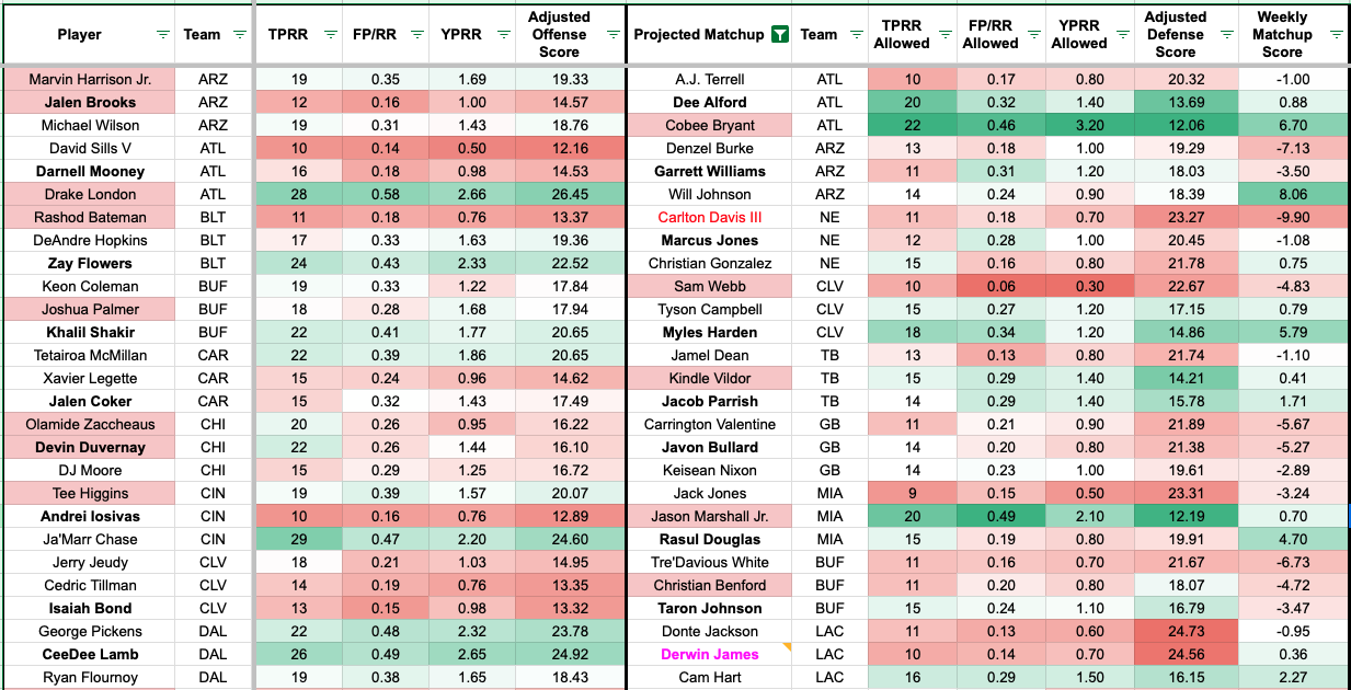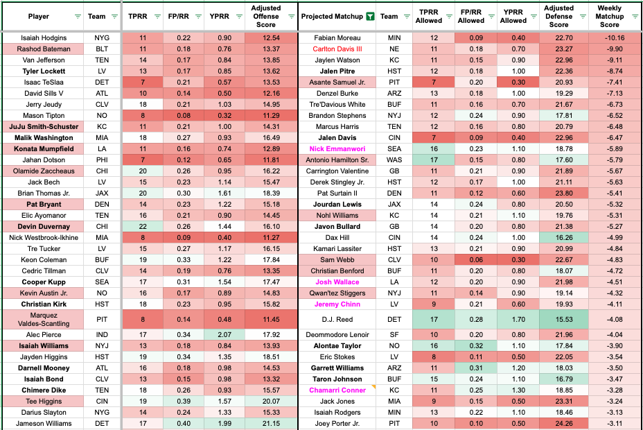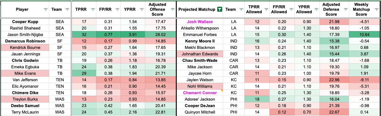 We added additional team-level metrics to the formula to account for team context. The red numbers indicate a more challenging matchup for the receiver, and the green numbers indicate a favorable matchup (or the defender allows a high rate on the given metric).
