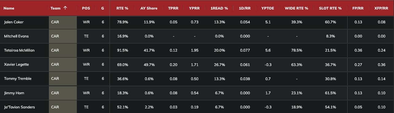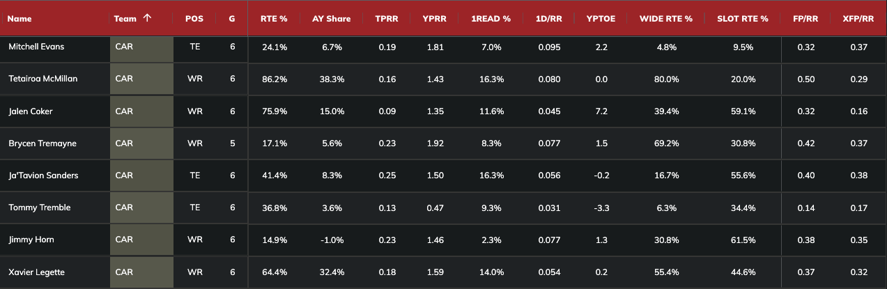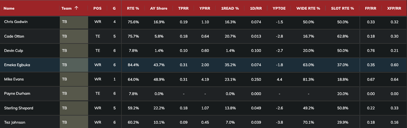 The Panthers deploy zone coverage at the second-highest rate and allow the 16th-most fantasy points per dropback. They tend to use single-high looks at the ninth-highest percentage and give up the 15th-highest fantasy points per dropback. Egbuka leads the Buccaneers in yards per route run (2.12) against zone coverage and target rate (30 percent), as seen below.