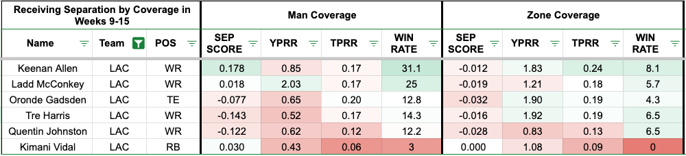 Allen leads the Chargers in target rate (24 percent) against zone coverage, compared to McConkey's 18 percent target rate. Gadsden, Allen, and Harris average over 1.80 yards per route run against zone coverage in Weeks 9-15. Meanwhile, McConkey's production has been better against man coverage (2.03) than zone (1.21) over the past several weeks.