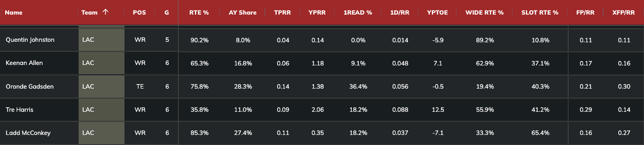 The visual below shows the Chargers' pass catchers in Weeks 9-15, with a minimum of 25 routes.