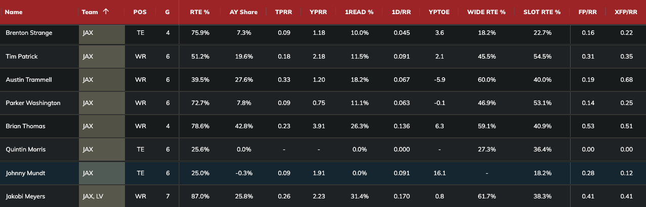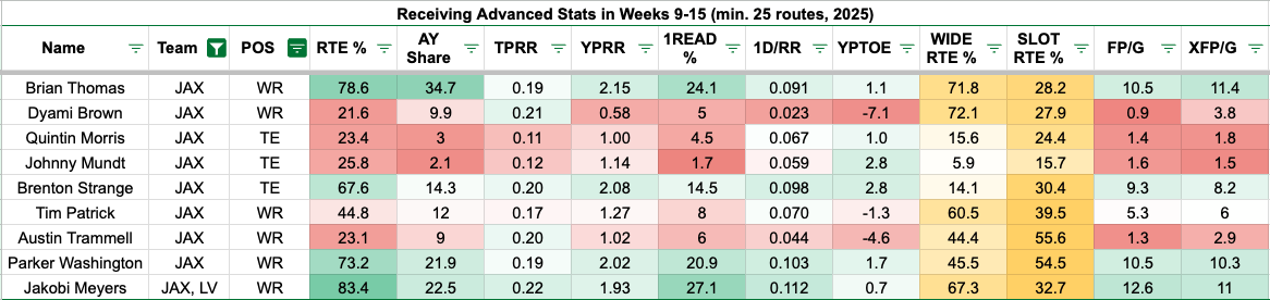Since Week 9, Meyers leads the Jaguars in first-read target share, though he joined the team in Week 10. Over the past three games with Thomas and Meyers healthy together, Meyers bests him in first-read target share (32.8 percent vs. 26.2 percent). However, Thomas (2.21), Meyers (2.20), and Parker Washington (2.55) averaged over two yards per route run in Weeks 13-15. It's partly matchup-related, as the Jaguars faced the Titans, Colts, and Jets over the past three contests.