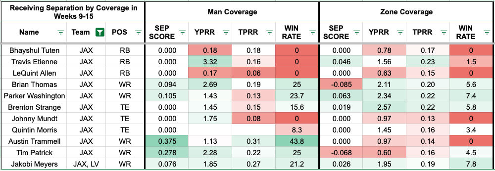 The visual below shows the Jaguars' pass catchers when they face Cover 1 in Weeks 9-15.