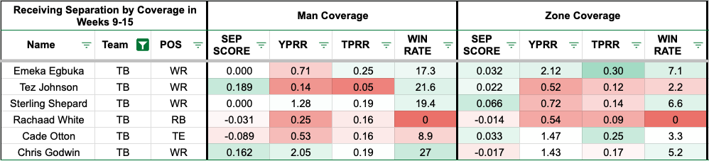 The visual below shows the Buccaneers' pass catchers against single-high coverages in Weeks 9-15.