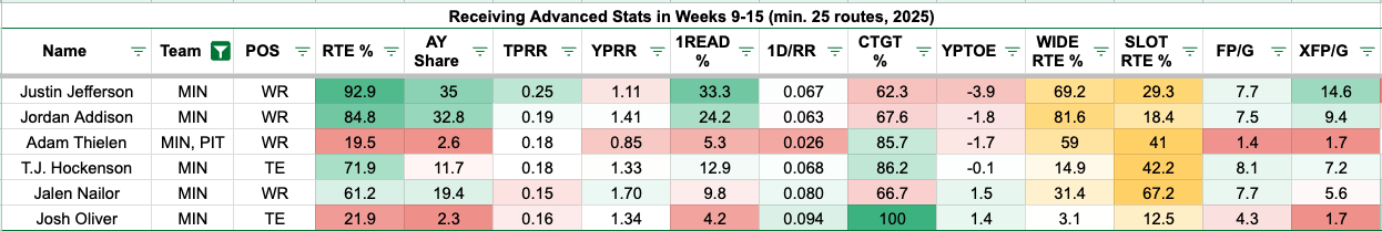 The visual below shows the Vikings' pass catchers against single-high coverages in Weeks 9-15.