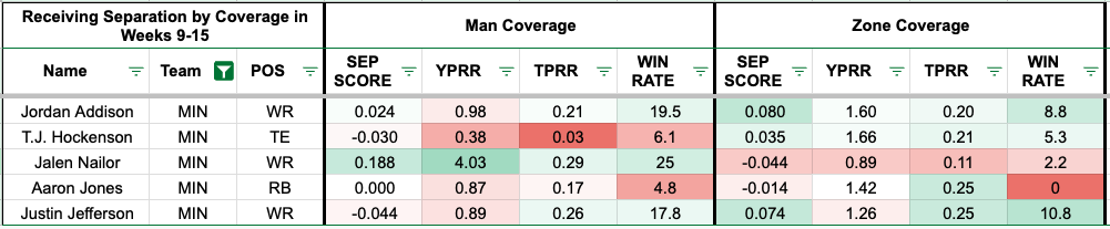 Meanwhile, the Giants have been allowing the 18th-most fantasy points per dropback when using zone coverage (No. 31). Unfortunately, Addison struggles against man coverage, with 0.98 yards per route run in Weeks 9-15. Jefferson has been worse, with 0.89 yards per route run against man coverage while being targeted on 26 percent of his routes. Weirdly, Jalen Nailor leads the team in yards per route run (4.03) and Average Separation Score.