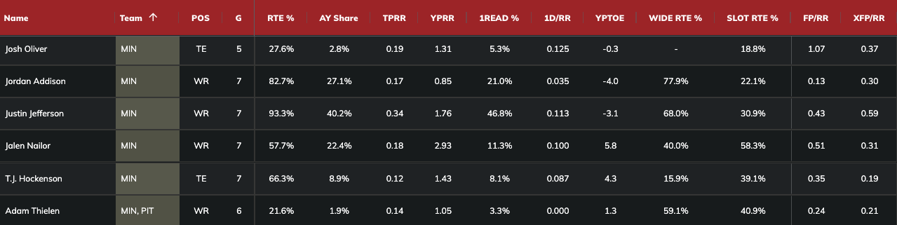 Specifically, the Giants deploy the sixth-highest rate of single-high looks and give up the 15th-most fantasy points per dropback. Jefferson garners an elite 48 percent first-read target share with Addison behind him at 21 percent against single-high during Weeks 9-15. Addison averaged under 1.00 yards per route run (0.85) as the most inefficient Vikings' pass catcher with -4.0 YPTOE, as seen below.