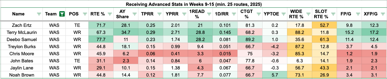 The visual below shows the Commanders' pass catchers when the quarterback sees pressure in Weeks 9-15.