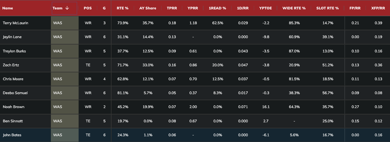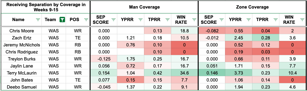 If we had a trivia game to guess which Commanders' pass catcher leads the team in yards per route run against zone coverage, it probably wouldn't be McLaurin. He boasts a team-high 3.73 yards per route run while earning a 23 percent target rate. McLaurin earns a 42 percent target rate against man coverage, yet a lowly 1.04 yards per route run.