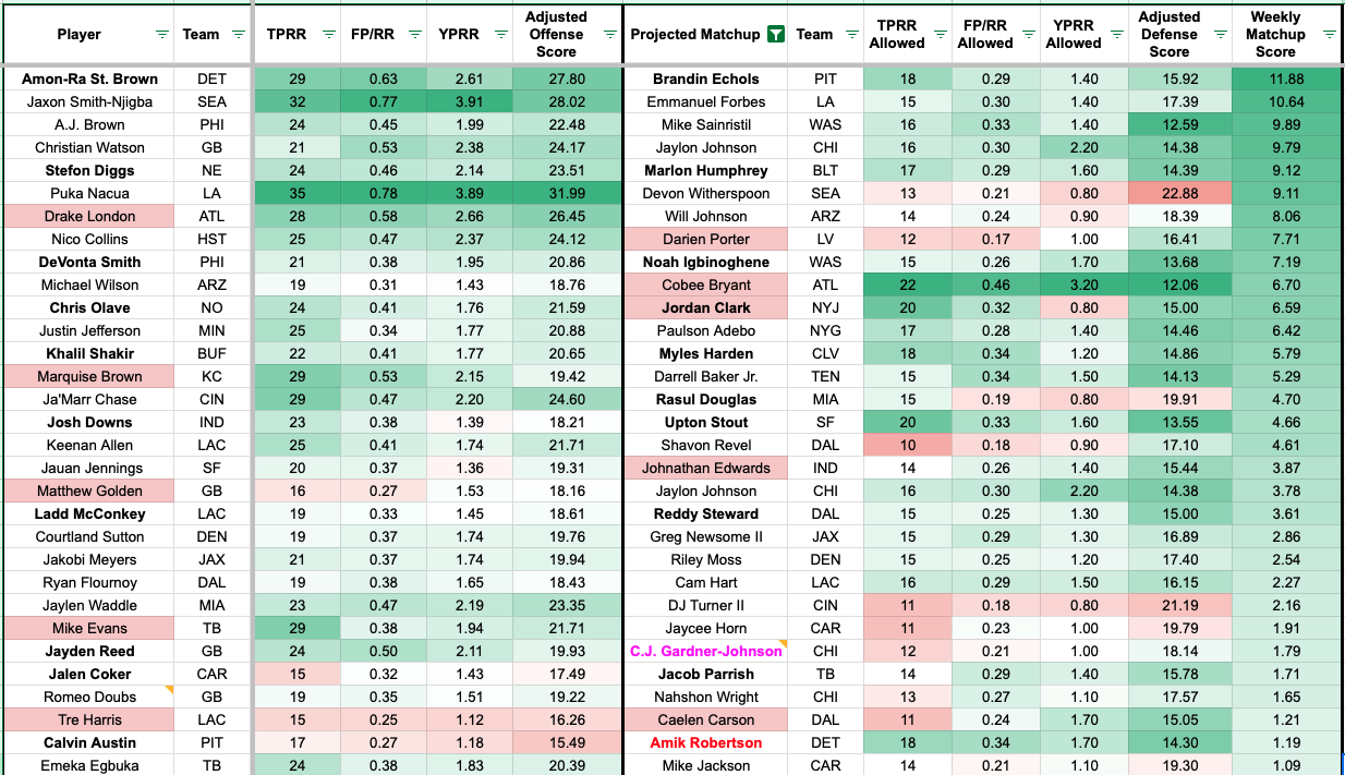 The WR/CB Matchup Chart is back again for 2025! You can find it below! We'll have the most favorable and unfavorable matchups based on several metrics. We used weighted averages to create an adjusted offensive and defensive score. Some inputs include yards per route run, fantasy points per route run, and targets per route run.