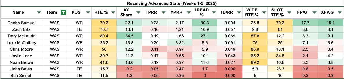 Moore trails his teammate in nearly all the underlying metrics in 2025. Rome Odunze has been producing and receiving usage as a high-end receiver or borderline WR1-type option. However, Moore continues to be a receiver to sit and downgrade in Week 6 WR/CB matchups.