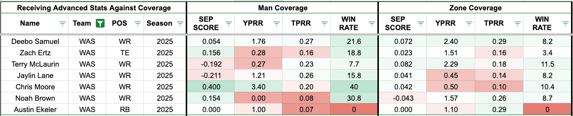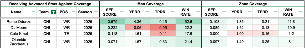 It's a small sample, but Moore has a six percent target rate while averaging an awful 0.06 yards per route run against Cover 1. Meanwhile, Odunze and Cole Kmet have been the best two options against Cover 1 in 2025. Odunze leads the Bears, with a ridiculous 50 percent target per route rate and averaging over five yards per route run (5.28) against Cover 1.
