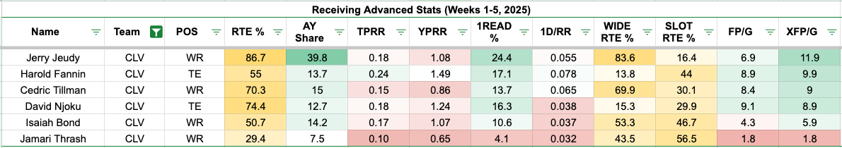 In Dillon Gabriel's first start in Week 5, he targeted David Njoku and Harold Fannin Jr. 39.4 percent of the time, while Jeudy had a 15.2 percent target share against the Vikings. That might suggest Gabriel favors the tight ends with those short-area targets instead of the receivers downfield, or it's a one-game small sample.