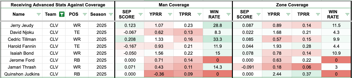 Jeudy hasn't been productive against man coverage while earning a team-high in targets per route. The Steelers are utilizing tons of single-high coverage. Jeudy struggles against single-high looks in 2025, averaging an 18 percent target rate and yards per route run under one (0.86).