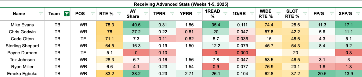Godwin's usage to begin the 2025 season has been in the high-end range, suggesting fantasy managers should buy low. Evans and Emeka Egbuka have been leading the team in first-read target share, yards per route run, and expected fantasy points.