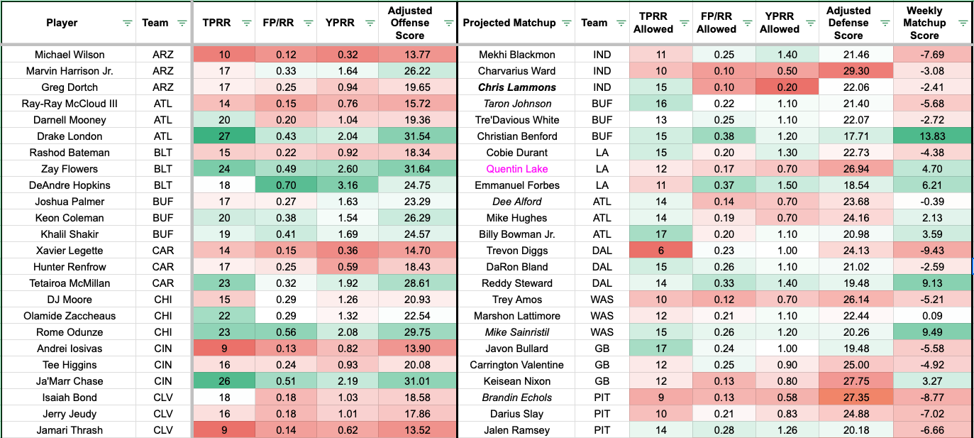 The red numbers indicate a more challenging matchup for the receiver, and the green numbers mean favorable matchups (or the defender allows a high rate of the given metric). The visual below shows offenses from the Arizona Cardinals to the Cleveland Browns.
