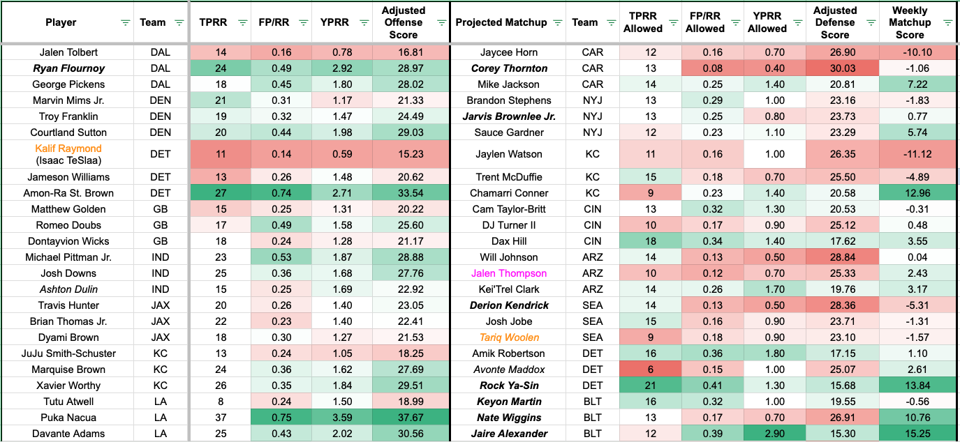We'll have a weekly matchup score with those adjusted scores by subtracting the defensive number from the offensive one. The caveat would be the limited data due to injured offensive and defensive players, possibly skewing the matchups to be more or less favorable. Since this is a newer process, there might be some slight tweaks along the way. With more data from the 2025 season, we'll learn what matchups to target and ones to temper expectations.