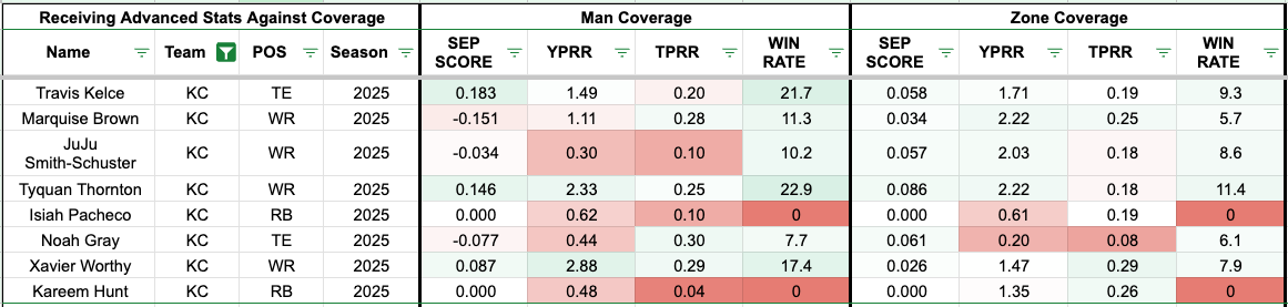 Worthy leads the Chiefs in yards per route run (2.88) while nearly matching Noah Gray (30 percent) and Marquise Brown (28 percent) in target per route rate against man coverage. Specifically, the Lions use Cover 1 at the fifth-highest rate, which can be susceptible to deep routes downfield. Can you guess how Worthy fares against Cover 1?