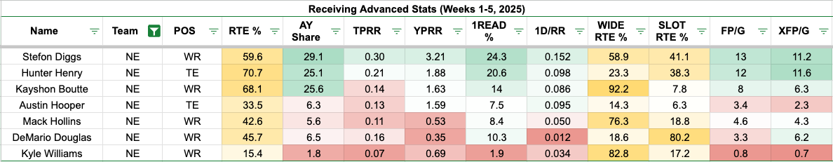 Diggs has seen his routes (56.2 percent) and targets (21 percent) in Weeks 1-3 increase in Weeks 4-5. That's evident in Diggs earning a target on 49 percent of his routes in Weeks 4-5 while running a route on 67.2 percent of the team's dropbacks. It's no coincidence that the Patriots rank first in EPA per dropback and first in explosive pass percentage in Weeks 4-5.