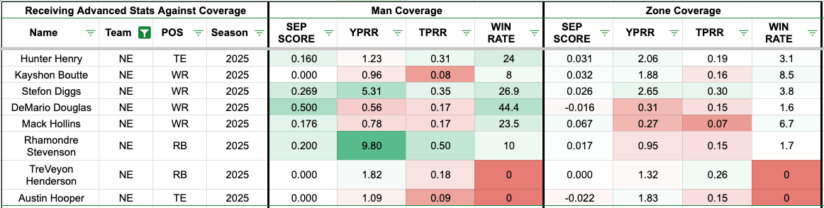 The Saints specifically prefer to use Cover 3 at the fifth-highest rate. Diggs leads the team with a 27 percent target rate and 3.49 yards per route run in 2025 against Cover 3, making him an ideal candidate to be a target-earning weapon against the Saints.