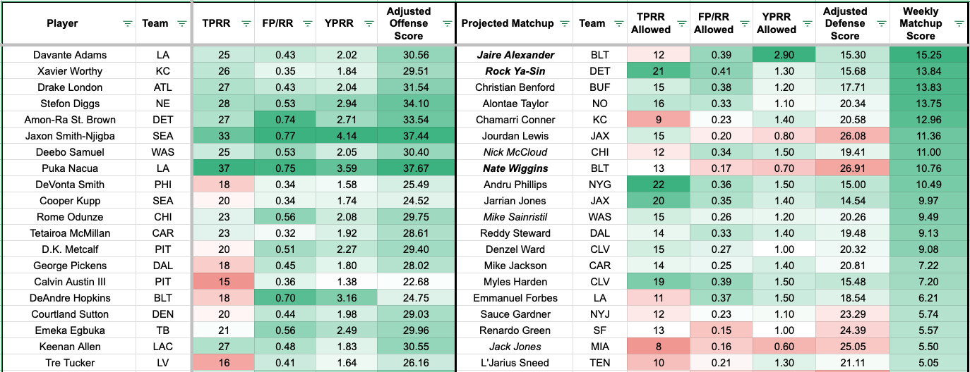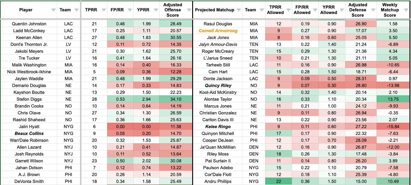 Most teams mix in defensive backs all over the field, with very few cornerbacks shadowing an opposing top receiver. The main takeaway involves not overreacting to a weaker matchup if the receiver is a high-end to near-elite target earner and producer in their respective offense. Based on the weekly matchups, we'll use various tools to find several matchup upgrades and downgrades for the opposing receivers.