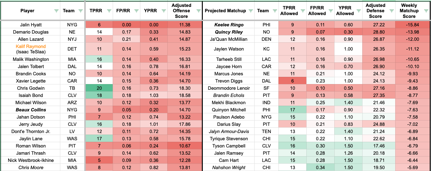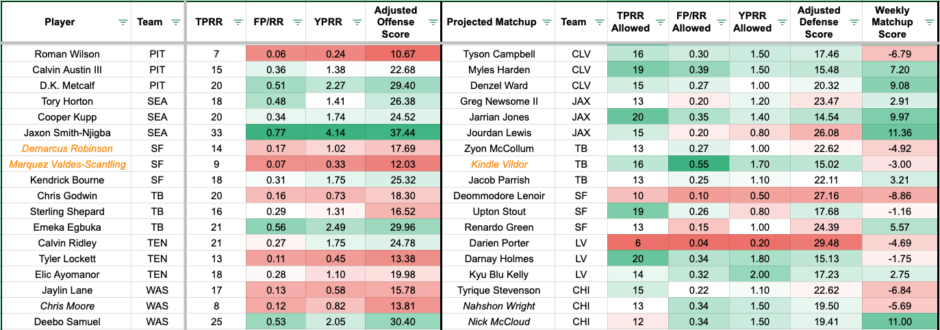 One way to use this chart is to identify weaker or tougher projected matchups in the given week. Another purpose involves identifying which team-level matchups to target. For instance, if multiple receivers have a positive or green matchup score on the same team, that indicates the opposing secondary could be a favorable matchup.