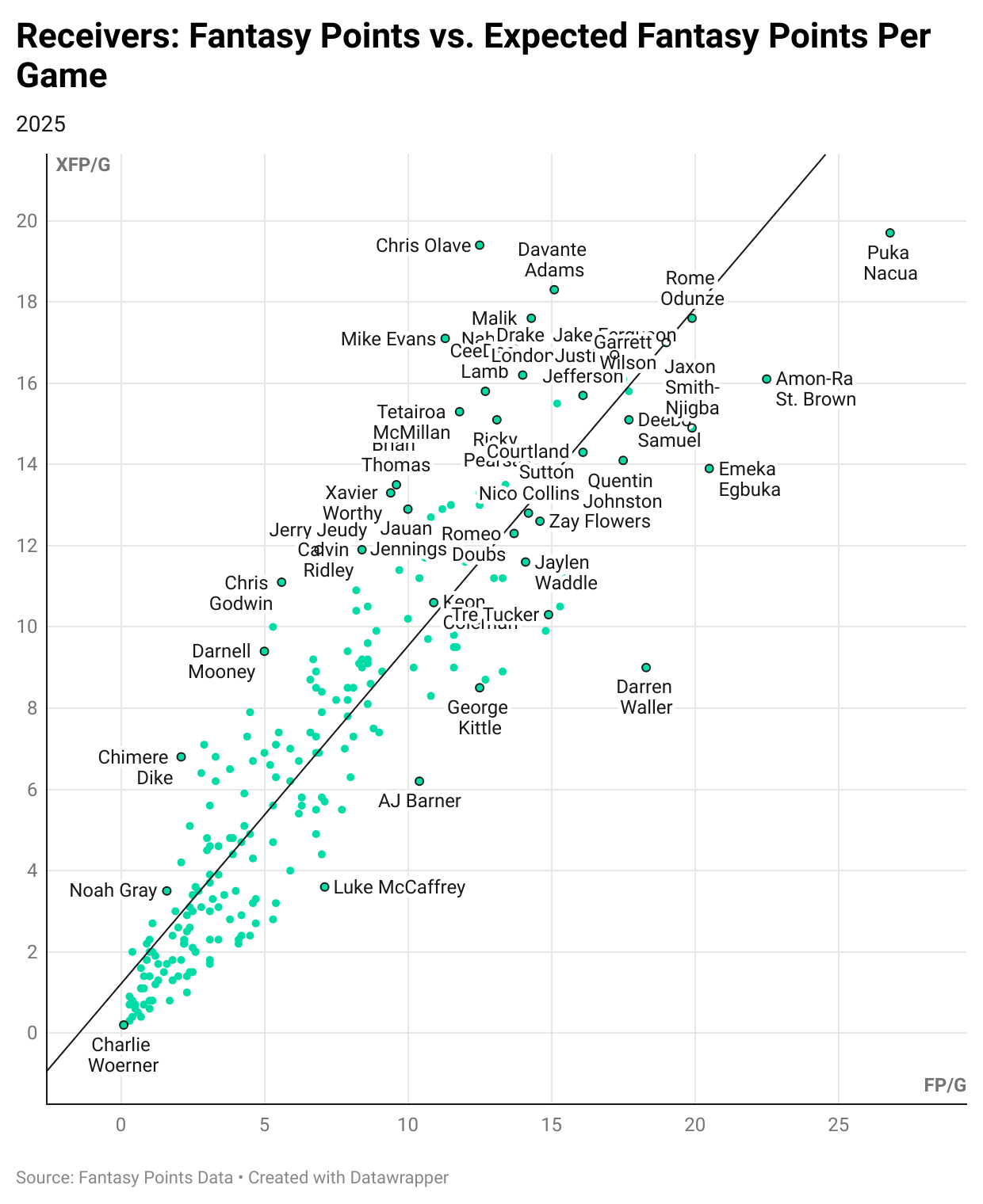 Only Chris Olave, Mike Evans, and Chris Godwin average more negative fantasy points over expected per game, suggesting they might be buy-low options. Unfortunately, Jeudy might have the worst quarterback situation among those underperforming pass catchers.