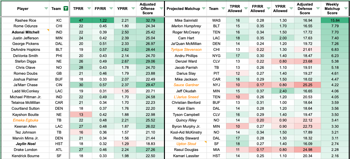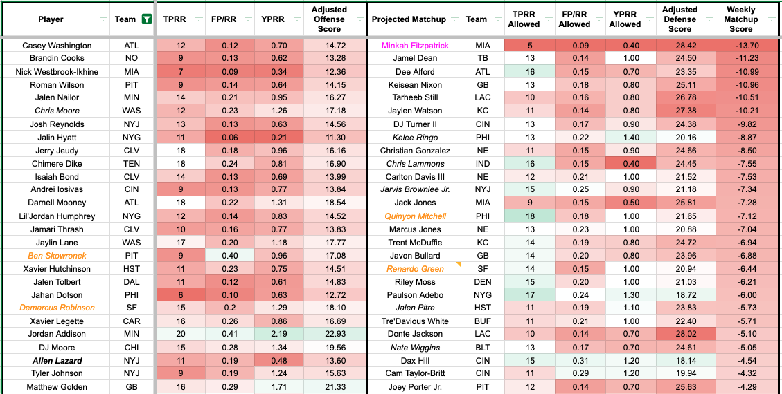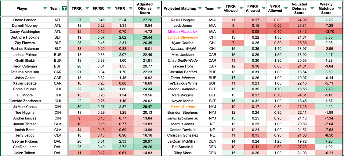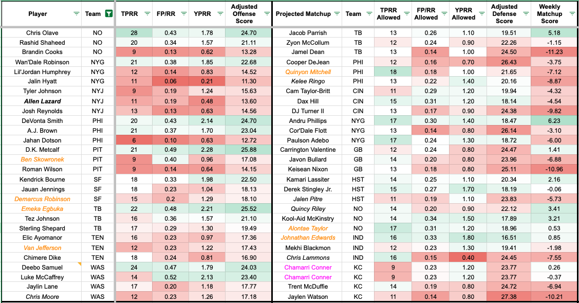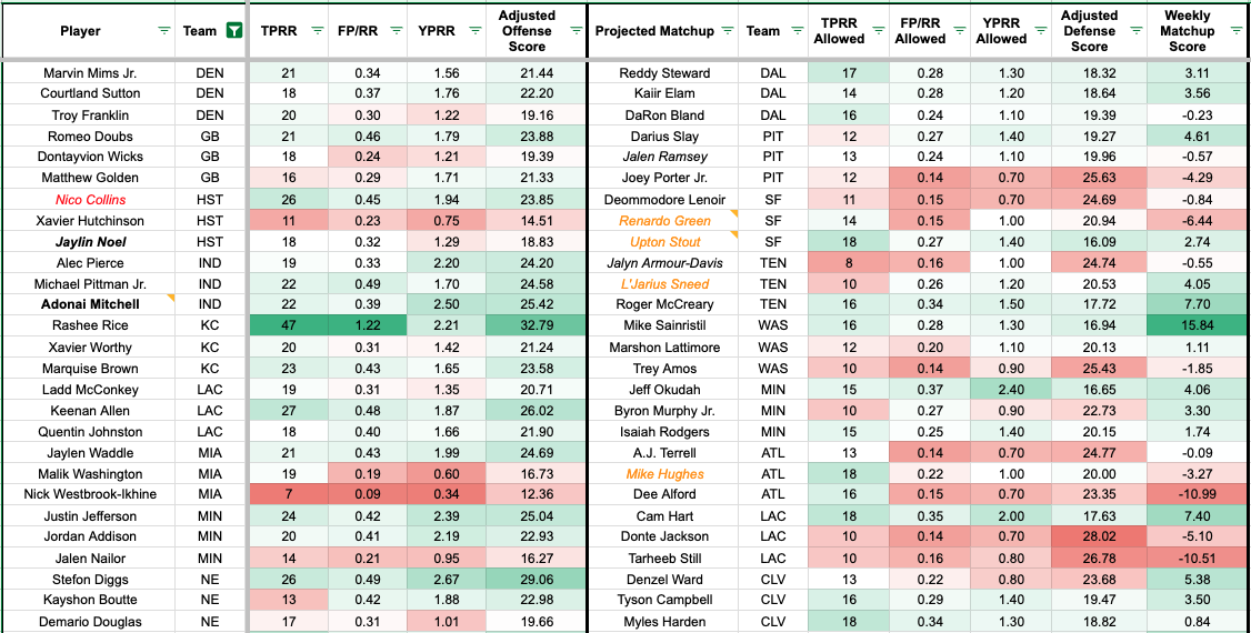 We added additional team-level metrics to the formula to account for team context. The red numbers indicate a more challenging matchup for the receiver, and the green numbers mean favorable matchups (or the defender allows a high rate of the given metric).