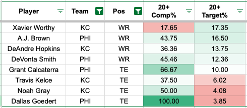 Brown led the team in yards per route run at 2.22 against two high looks, with Smith close behind at 2.01 and Goedert down at 1.19. Besides two high safety coverage, the Chiefs use the sixth highest rate of Cover 4, with one goal to limit deep passing plays.
