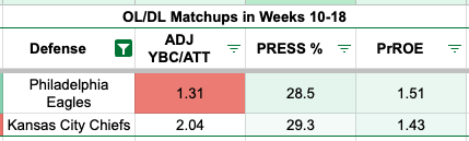 The Eagles ranked third in adjusted yards before contact per attempt in Weeks 10-18, suggesting the Chiefs may need to lean on the passing game. Interestingly, the Eagles defense allowed the 20th-ranked pressure rate (28.5 percent), suggesting they don't tend to pressure the quarterback.