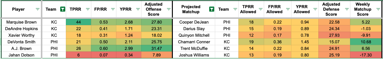 Below, we'll see the WR/CB matchups for the Super Bowl sorted alphabetically. The red numbers indicate a more challenging matchup for the receiver, and the green numbers mean favorable matchups (or the defender allows a high rate of the given metric).