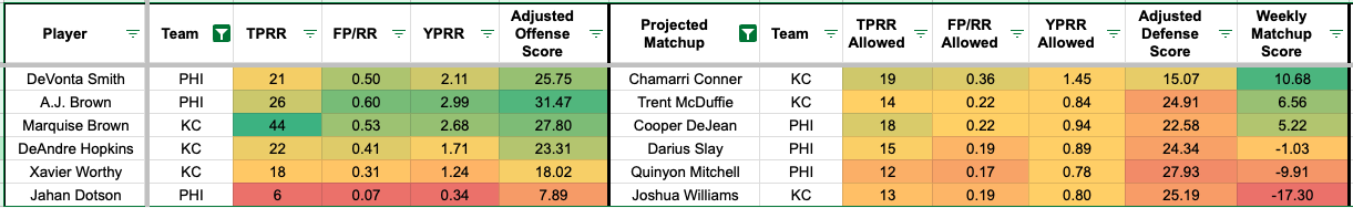 We'll have a weekly matchup score with those adjusted scores, which are calculated by subtracting the defensive from the offensive number. The caveat is that limited data due to injured offensive and defensive players could skew the matchups to be more or less favorable. Since this is a newer process, there might be some slight tweaks along the way.