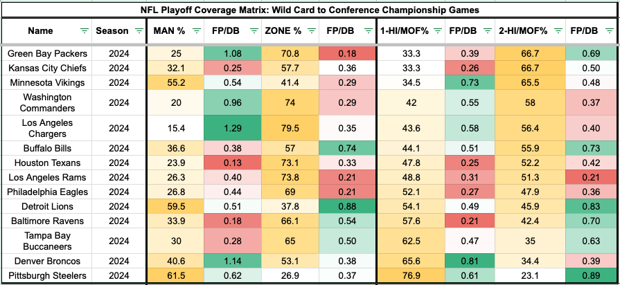 The Chiefs' pass defense used the highest rate of two-high safety coverages in the playoffs, tying them with the Packers. That's similar to the Chiefs ranking second in two-high coverages in the regular season. They allowed the second-lowest fantasy points per dropback (0.36) in the regular season compared to 0.50 in the playoffs when using two-high looks.