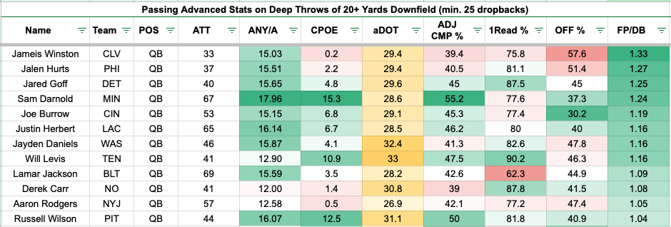 However, it might be strength versus strength because Jalen Hurts ranked eighth in adjusted yards per attempt (15.51) and second in fantasy points per dropback (1.27), yet 21st in completion rate over expected when attempting passes of 20 or more yards among 34 qualified quarterbacks with 25 dropbacks.