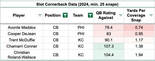 On paper, we're projecting rookie against the rookie, with Worthy facing Quinyon Mitchell. Mitchell allowed the seventh-fewest fantasy points per dropback and the 11th-lowest yards per route run. He allowed the seventh-highest forced incompletion rate (21 percent) and the seventh-most pass breakups.