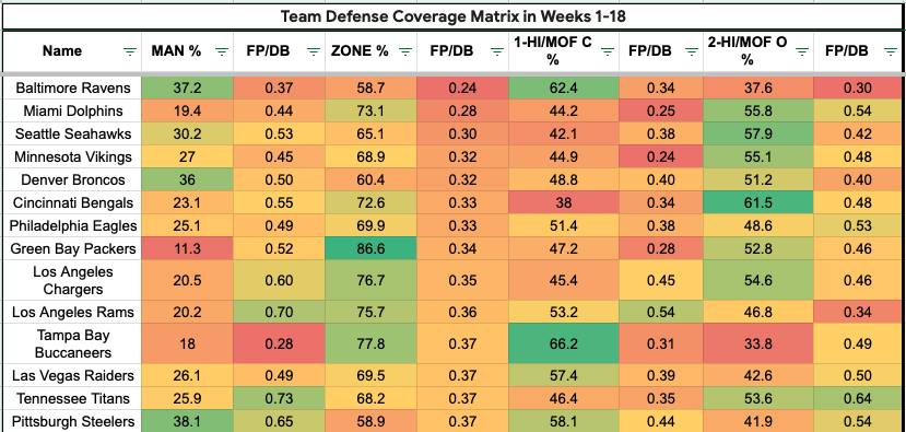 During the playoffs, the Eagles' pass defense ran zone coverage 69 percent of the time while allowing the third-fewest fantasy points per dropback against the zone. That's similar to their season-long defensive data, with the Eagles using zone 69.9 percent of the time (No. 12), with the sixth fantasy points per dropback (0.33).